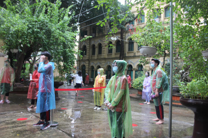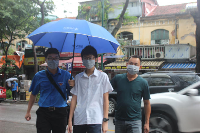 Theo lịch, 8h30 thí sinh bắt đầu làm bài thi, nhưng từ sớm các thí sinh đã có mặt trước cổng trường. Ghi nhận của PV Pháp luật Plus tại trường THPT Việt Đức (quận Hoàn Kiếm). Dưới cơn mưa tầm tã, các thí sinh được các tình nguyện viên tiến hành đo thân nhiệt, khử khuẩn tay, hướng dẫn lối đi để lên phòng thi…