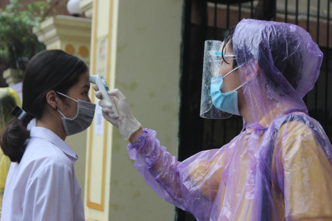 Tình nguyện viên đo thân nhiệt cho thí sinh.
