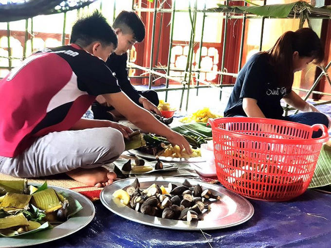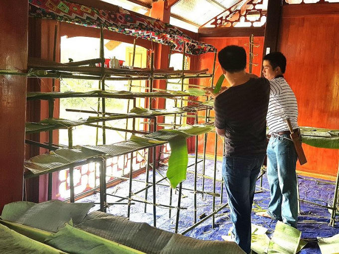 Thịt chó, lợn, gà và các vật phẩm khác sẽ được bày lên trên bàn thờ là dàn mâm tre lót lá chuối thế này để cúng thần linh