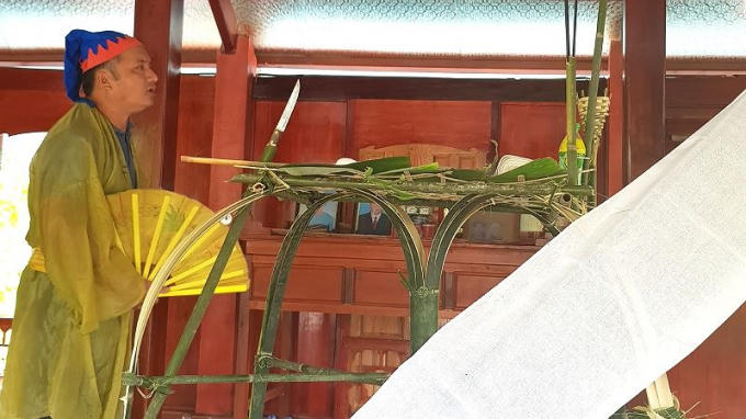 Thầy mo đến từ sớm để kể sử thi Đẻ đất đẻ nước bằng tiếng mường và cung thỉnh thần linh về chứng giám và gia hộ cho các thành viên trong gia đình.