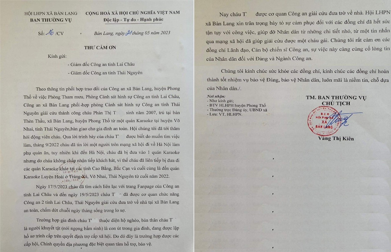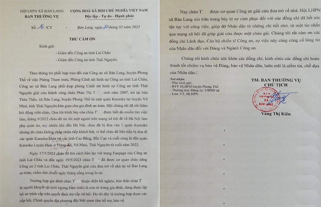 Hội Liên hiệp phụ nữ xã đã có thư bày tỏ sự cảm phục trước tinh thần trách nhiệm của lực lượng Công an. Cảm ơn Công an tỉnh Lai Châu, Thái Nguyên đã giúp đỡ người dân bằng một cách vô điều kiện và đề nghị tăng cường tuyên truyền, bảo vệ đối tượng là phụ nữ, trẻ em theo chủ trương của Đảng và Nhà nước.