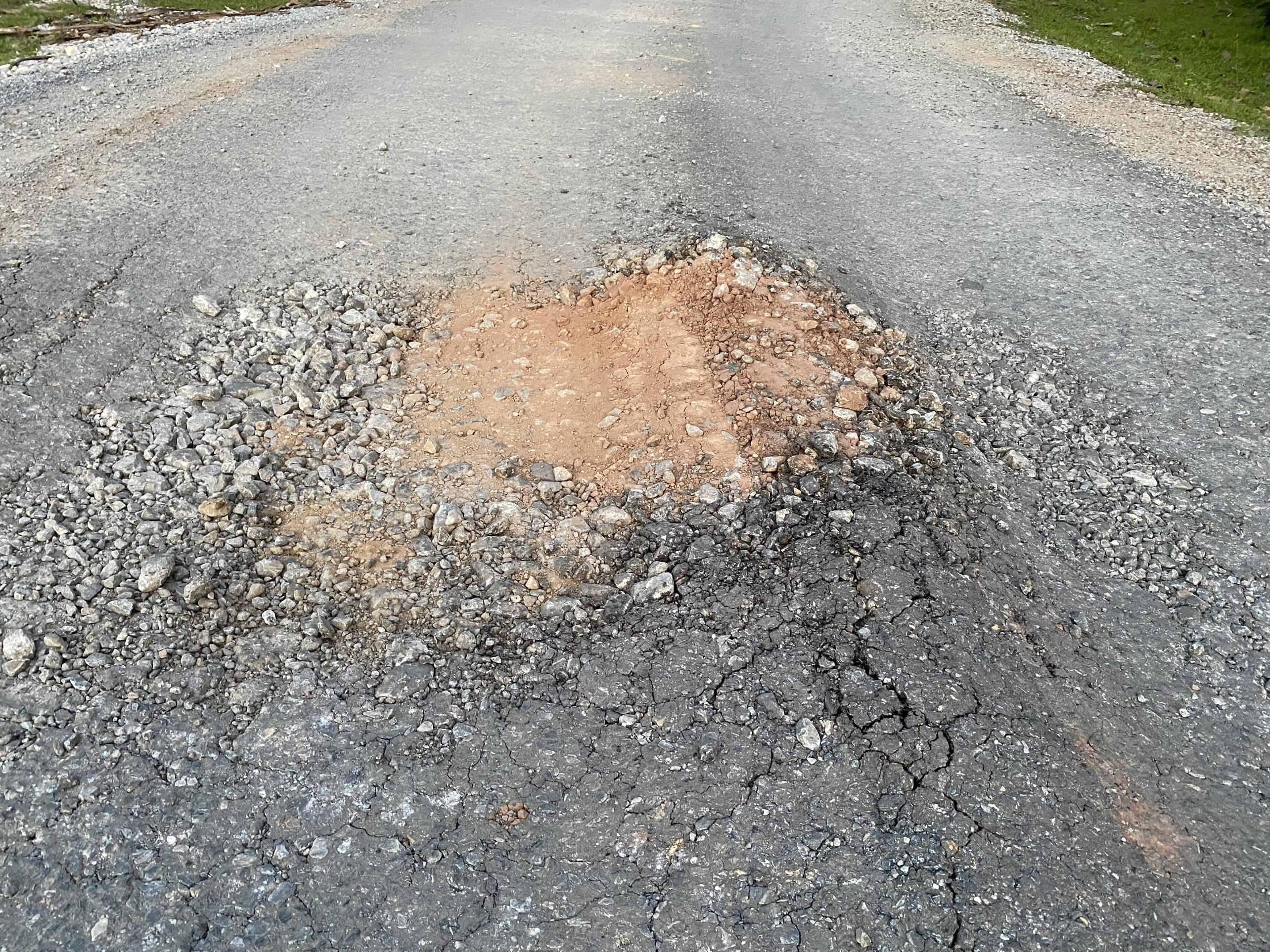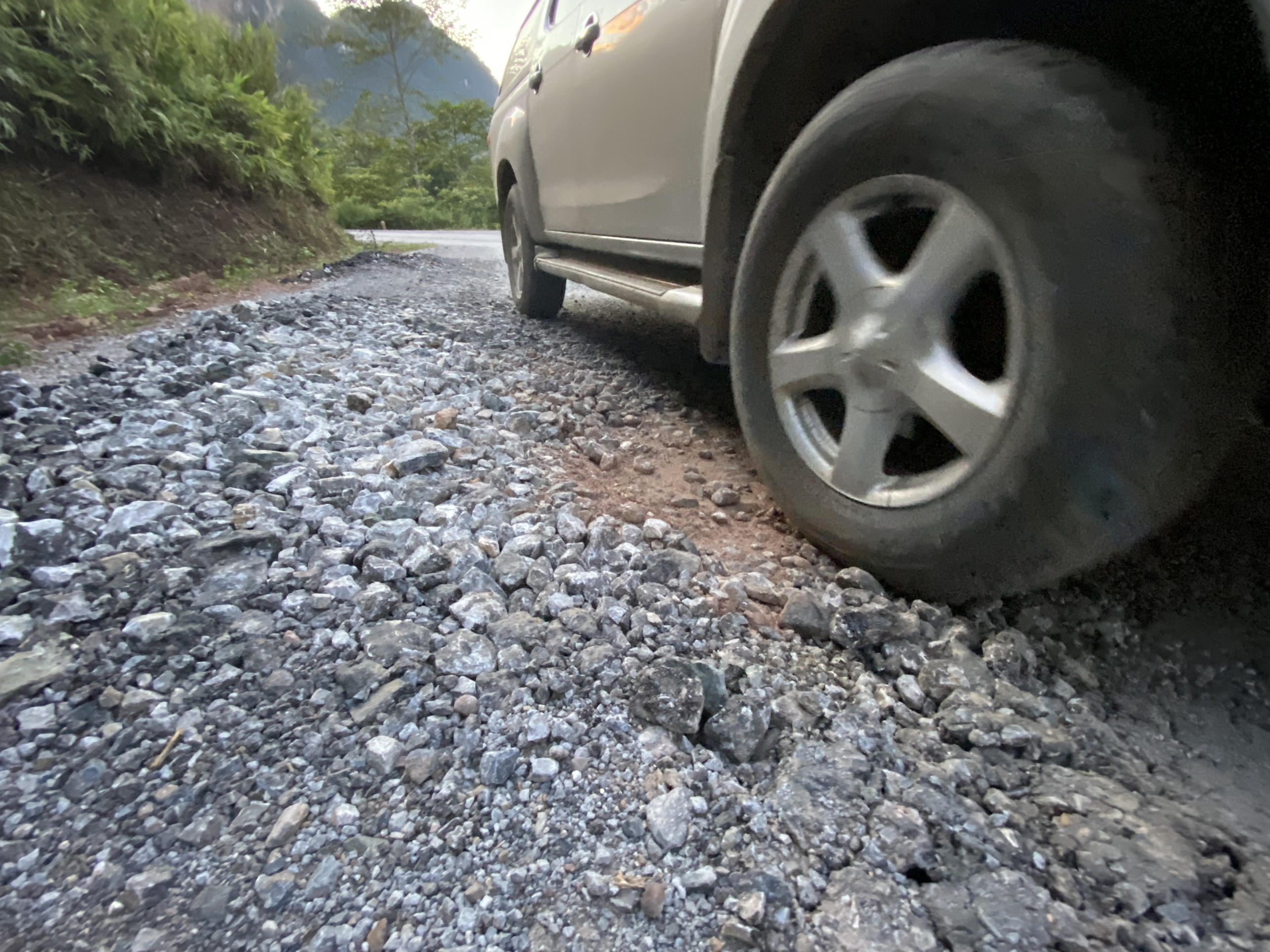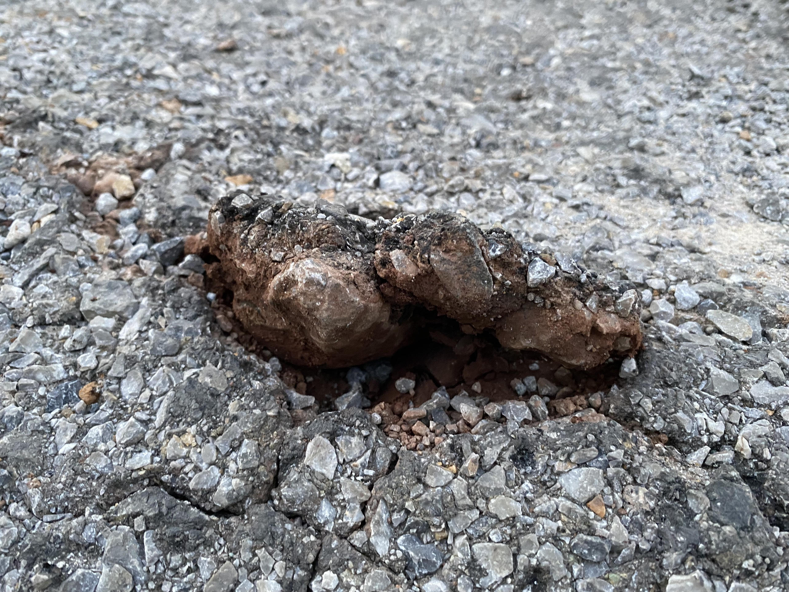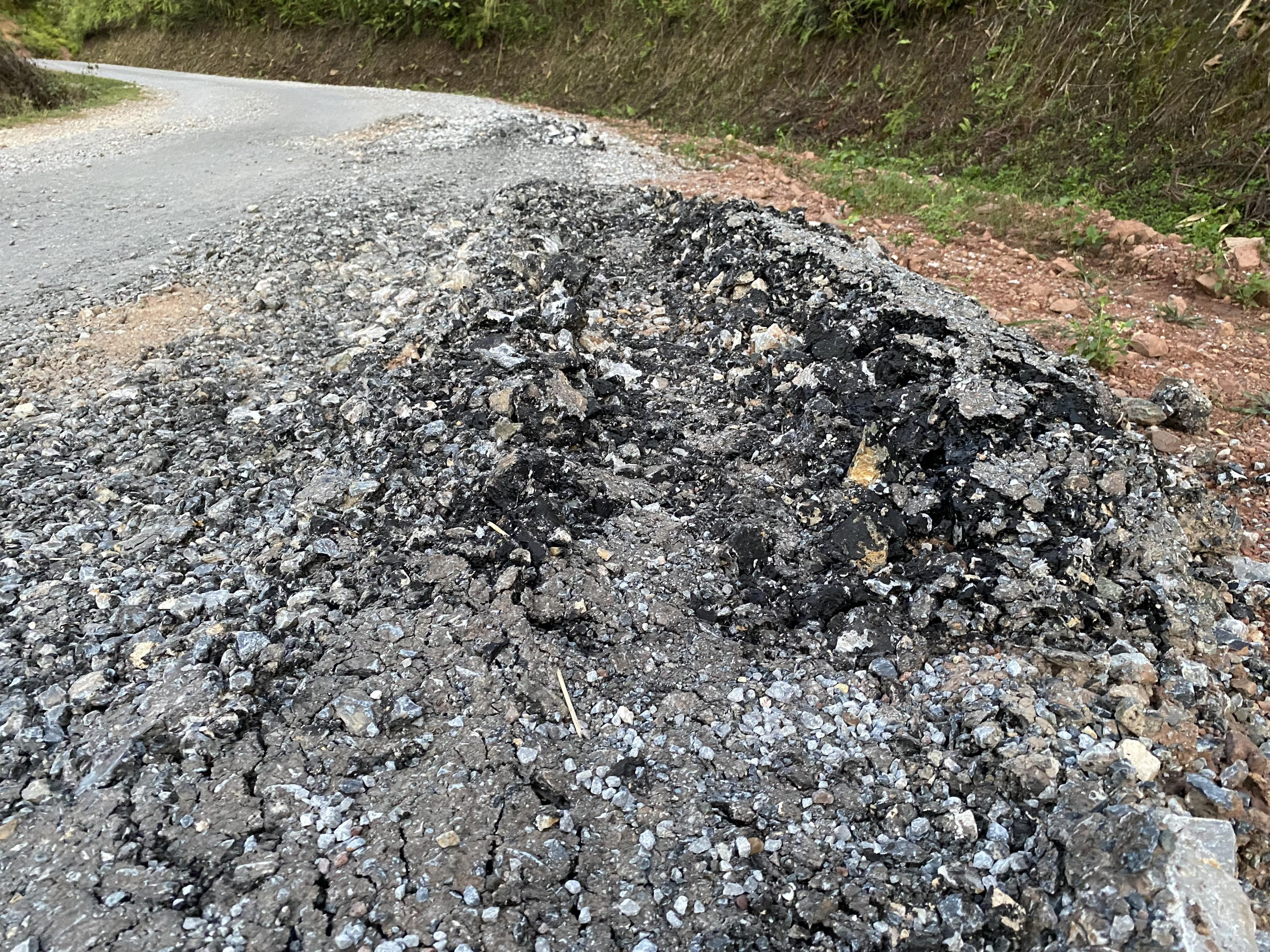 Tại những điểm bị nứt vỡ có thể dễ dàng dùng tay gảy nhẹ cũng ra cả mảng nhựa đường. Qua quan sát, phía dưới lớp nhựa đường mỏng dính ấy có lẫn cả đất và đá với nhau.