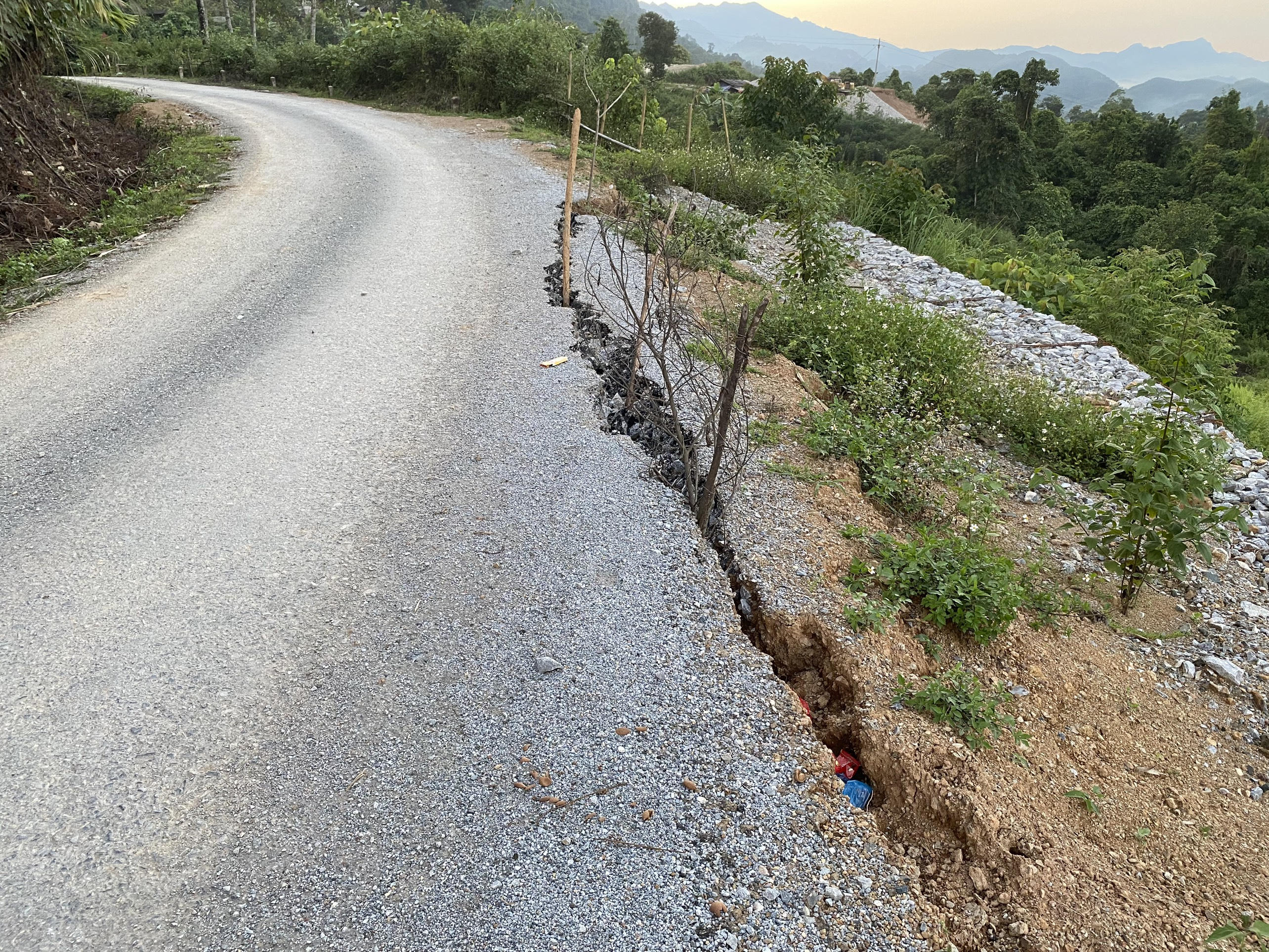 Một điểm trên tuyến đường xuất hiện vết nứt lớn, rộng khoảng 10cm, dài khoảng 4 – 5 mét. Tại điểm xuất hiện vết nứt này được kè bằng rọ đá thấp hơn mặt đường, có dấu hiệu bị xô lệch.