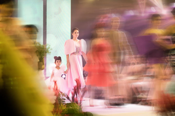 Xuất hiện trong thiết kế đầm tay bồng dáng xòe, gam màu hồng nude lộng lẫy, Lại Hương Thảo chứng minh kỹ năng catwalk của mình bằng những bước đi tự tin, làm chủ sân khấu. Cô trang điểm nhẹ nhàng, dắt tay mẫu nhí, sải bước thần thái trên sân khấu.