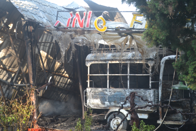 Tại hiện trường, 10 chiếc xe cổ và toàn bộ vật dụng bên trong quán bị ngọn lửa thiêu rụi.