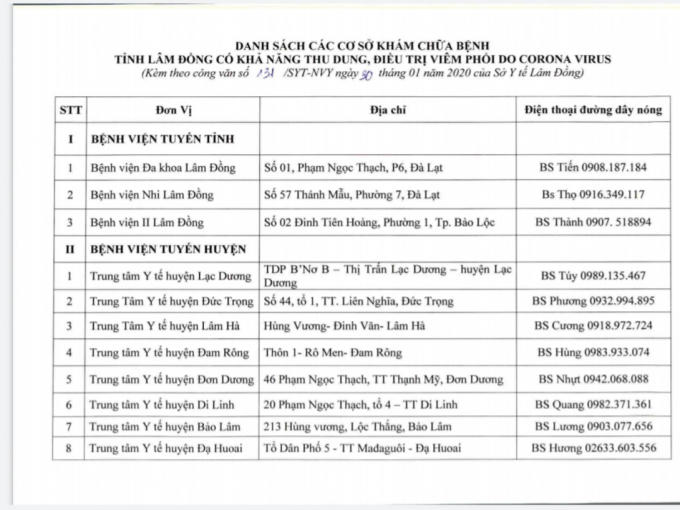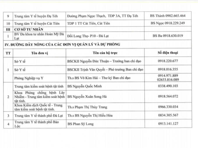 10 bệnh viện tuyến huyện gồm Trung tâm Y tế của 10/12 huyện, thành phố trực thuộc tỉnh này và Bệnh viện Đa khoa tư nhân Hoàn Mỹ, Đà Lạt, kèm danh sách nói trên còn có tên và số điện thoại của cán bộ trực.
