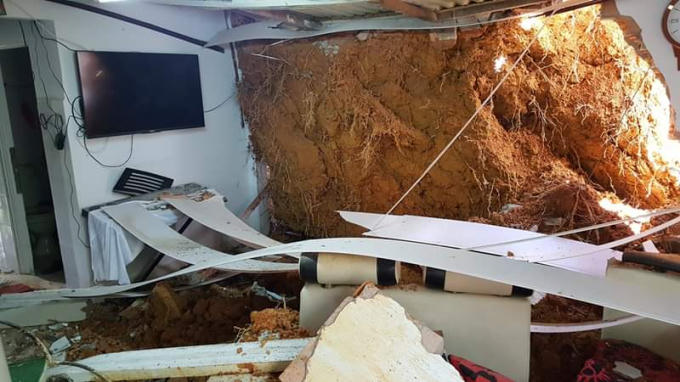 Đang ngủ bất ngờ đất đá từ trên cao rơi xuống, khiến ngôi nhà bị hư hỏng nặng, may mắn không ai thương vong.