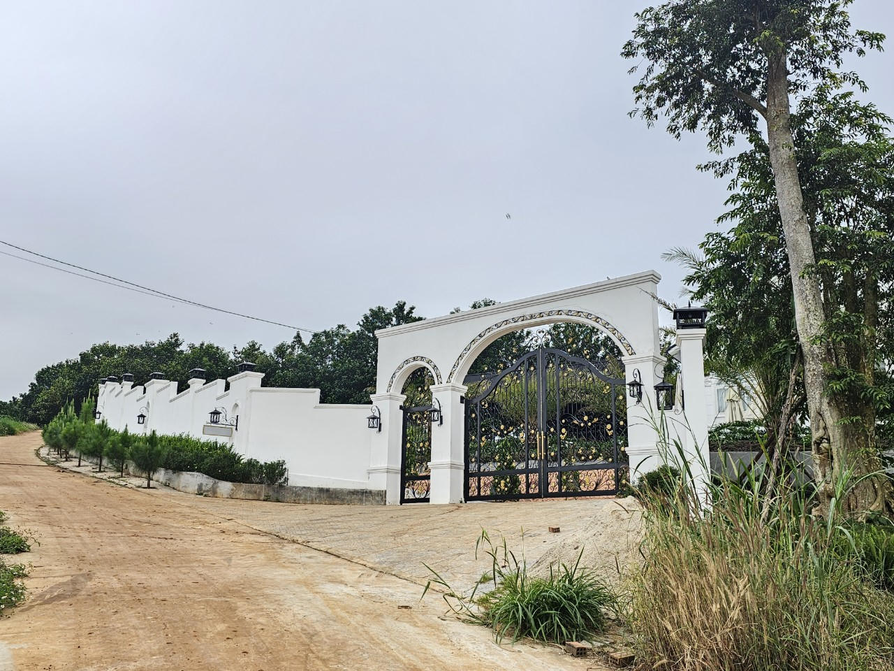 Toàn bộ căn biệt thự này được sơn màu trắng theo phong cách và kiến trúc nhà mái thái xung quanh các hạng mục sân, bậc tam cấp, tường bao xung quanh cao tầm 2m đã được hoàn thiện và đưa vào sử dụng.