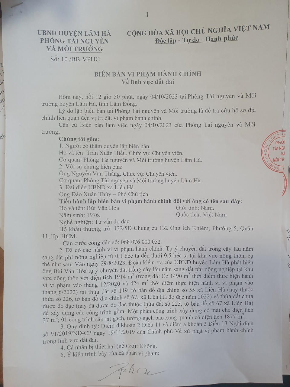 Theo tài liệu phóng viên Báo Pháp luật Việt Nam có được ngày 4/10/2023 Phòng tài nguyên và môi trường huyện Lâm Hà đã tiến hành lập biên bản vi phạm hành chính số 10 về lĩnh vực đất đai đối với ông Bùi Văn Hoà đã có hành vi hành chính như tự ý chuyển đất trồng cây lâu năm sang đất phi nông nghiệp từ 0,1ha đến 0,5ha tại khu vực nông thôn với tổng diện tích là 1914m2.