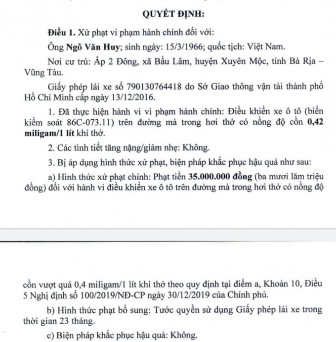 Ngoài phạt hành chính, ông Huy còn bị tước quyền sử dụng Giấy phép lái xe trong thời gian 23 tháng.
