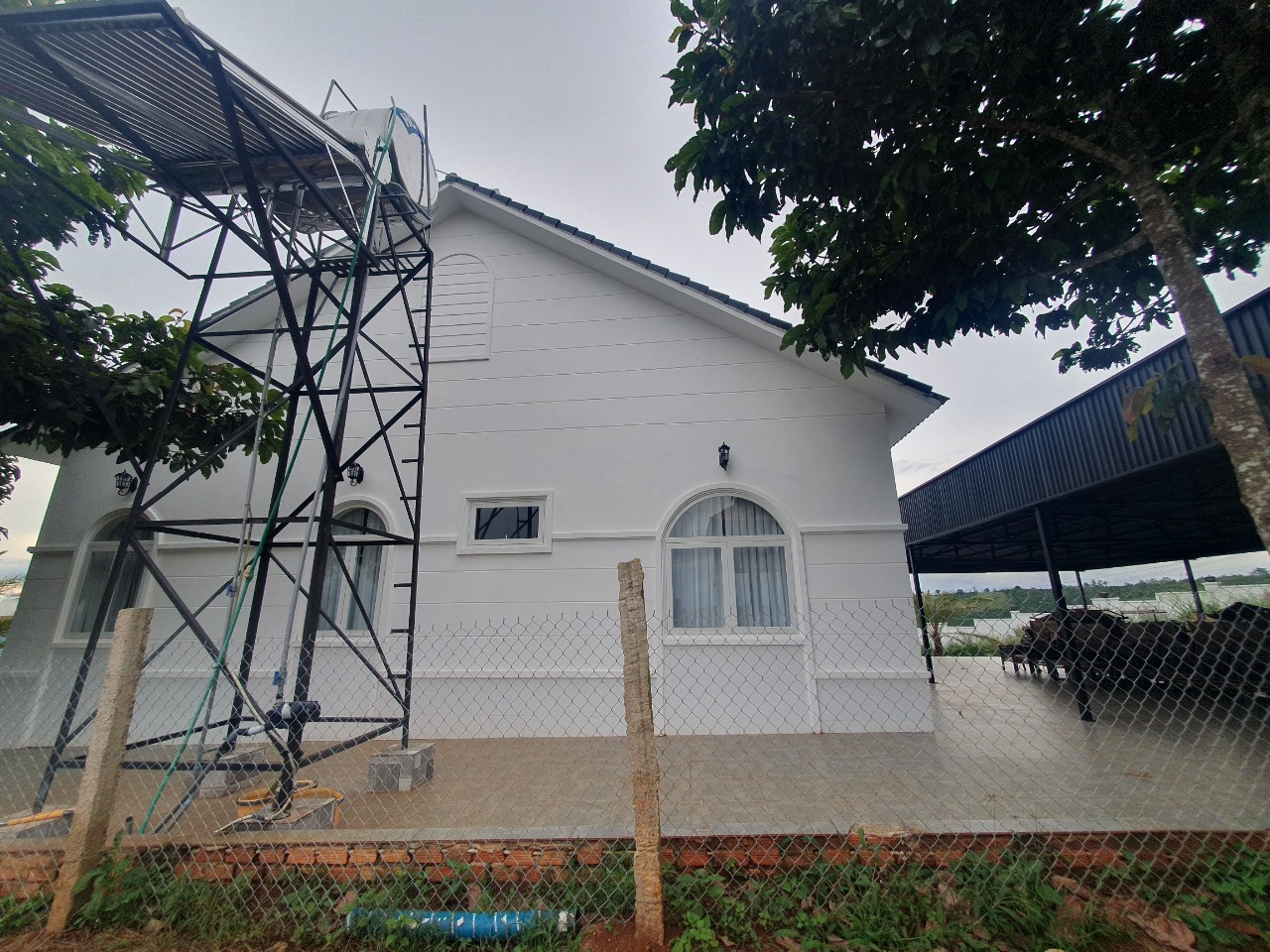 Toàn bộ căn biệt thự này được sơn màu trắng theo phong cách và kiến trúc nhà mái thái xung quanh các hạng mục sân, bậc tam cấp, tường bao xung quanh cao tầm 2m đã được hoàn thiện và đưa vào sử dụng.