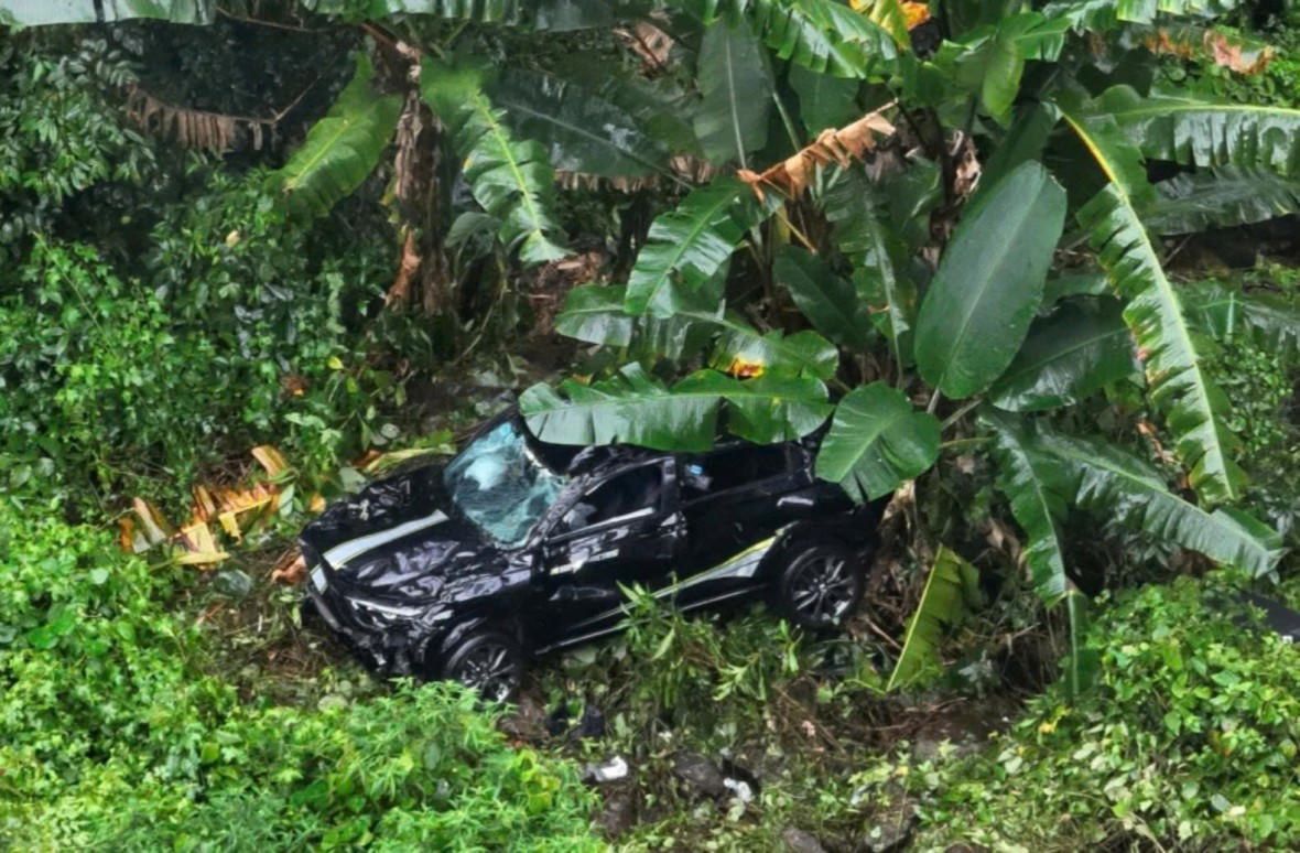 Chiếc xe con rơi xuống vực sâu khoảng 50 mét, phía dưới chủ yếu cây bụi và cây chối rừng nhưng xe bị hư hỏng nặng.