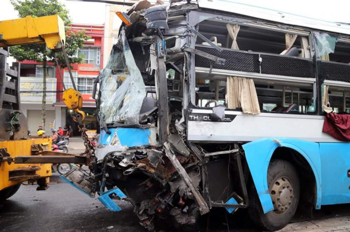 Xe khách bị hư hỏng nặng phần đầu sau vụ tai nạn.