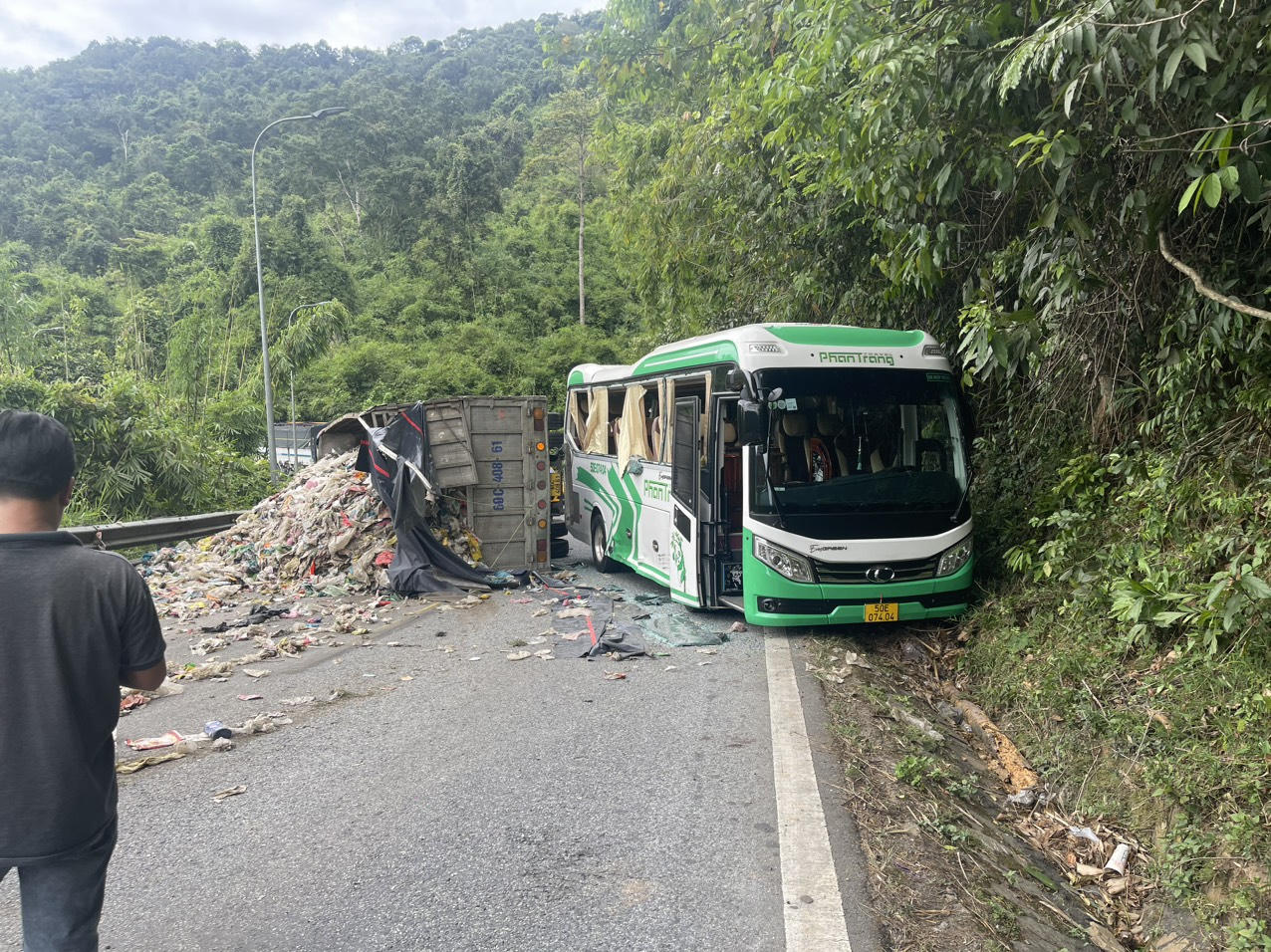 Vụ va chạm khiến xe tải bị lật nghiêng nằm chắn ngang đường khiến phế liệu đổ tràn xuống đường, xe khách bị ép dựa vào vách núi khiến toàn bộ kính xe bên phụ vỡ nát.
