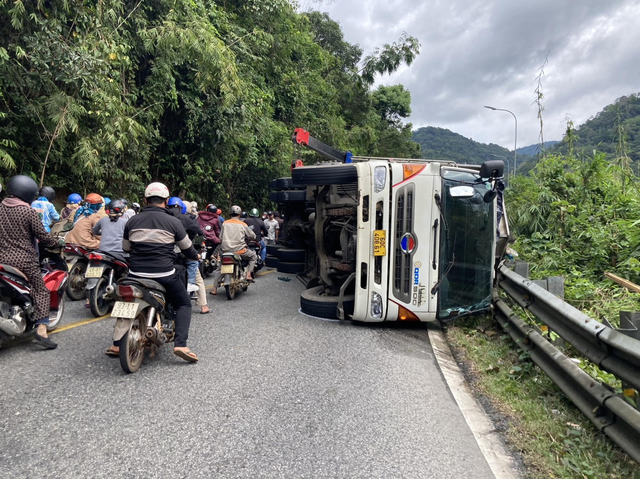 Chiếc xe tải bị lật va chạm với xe khách đang lên đèo khiến 5 bị thương, cả 2 xe hư hỏng nặng giao thông bị ách tắc cả 2 chiều