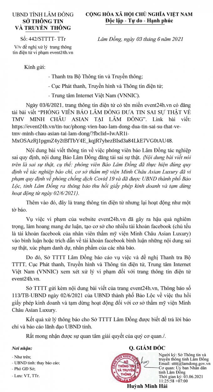 Chiều ngày 3/6, Sở Thông tin và Truyền thông tỉnh Lâm Đồng đã có văn bản gửi Thanh tra Bộ Thông tin và Truyền thông, Cục Phát thanh, Truyền hình và Thông tin điện tử cùng Trung tâm internet Việt Nam về việc xử lý trang thông tin điện tử event24h.vn.