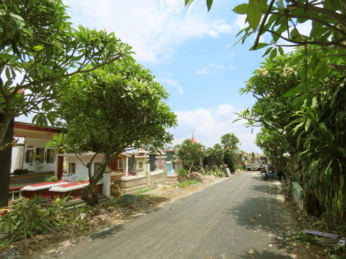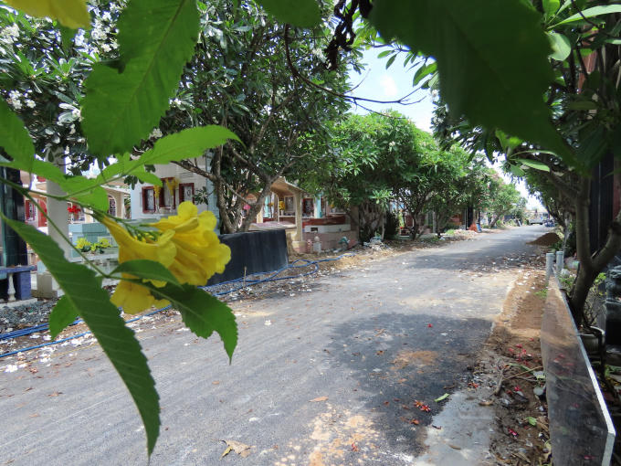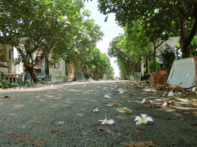 Con đường được rải đá mi, trải nhựa thẳng tắp cùng hoa sứ hai bên đường nở rộ.