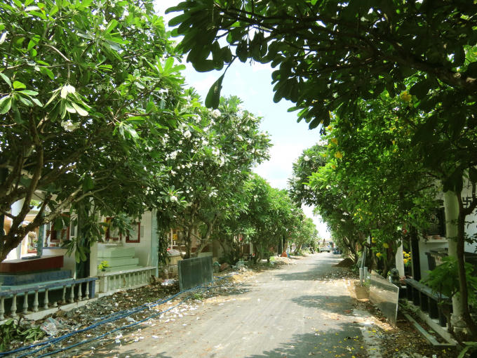 Con đường được rải đá mi, trải nhựa thẳng tắp cùng hoa sứ hai bên đường nở rộ.