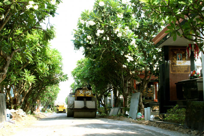 Sáng ngày 12/5, gần chục công nhân với xe lu, ủi đang tất bật khẩn trương nỗ lực hoàn thiện con đường nội bộ dẫn vào nghĩa trang hơn 200m. Ghi nhận tại khu vực thi công, con đường đã được rải đá mi, trải nhựa thẳng tắp cùng hoa sứ hai bên đường nở rộ.