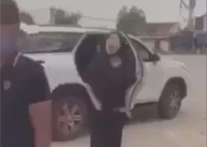 Nam nhân viên làm nhiệm vụ trước cổng đền đến yêu cầu chiếc xe ô tô di chuyển đi thì nhóm người đàn ông và người phụ nữ này ngồi trên xe chửi bới.