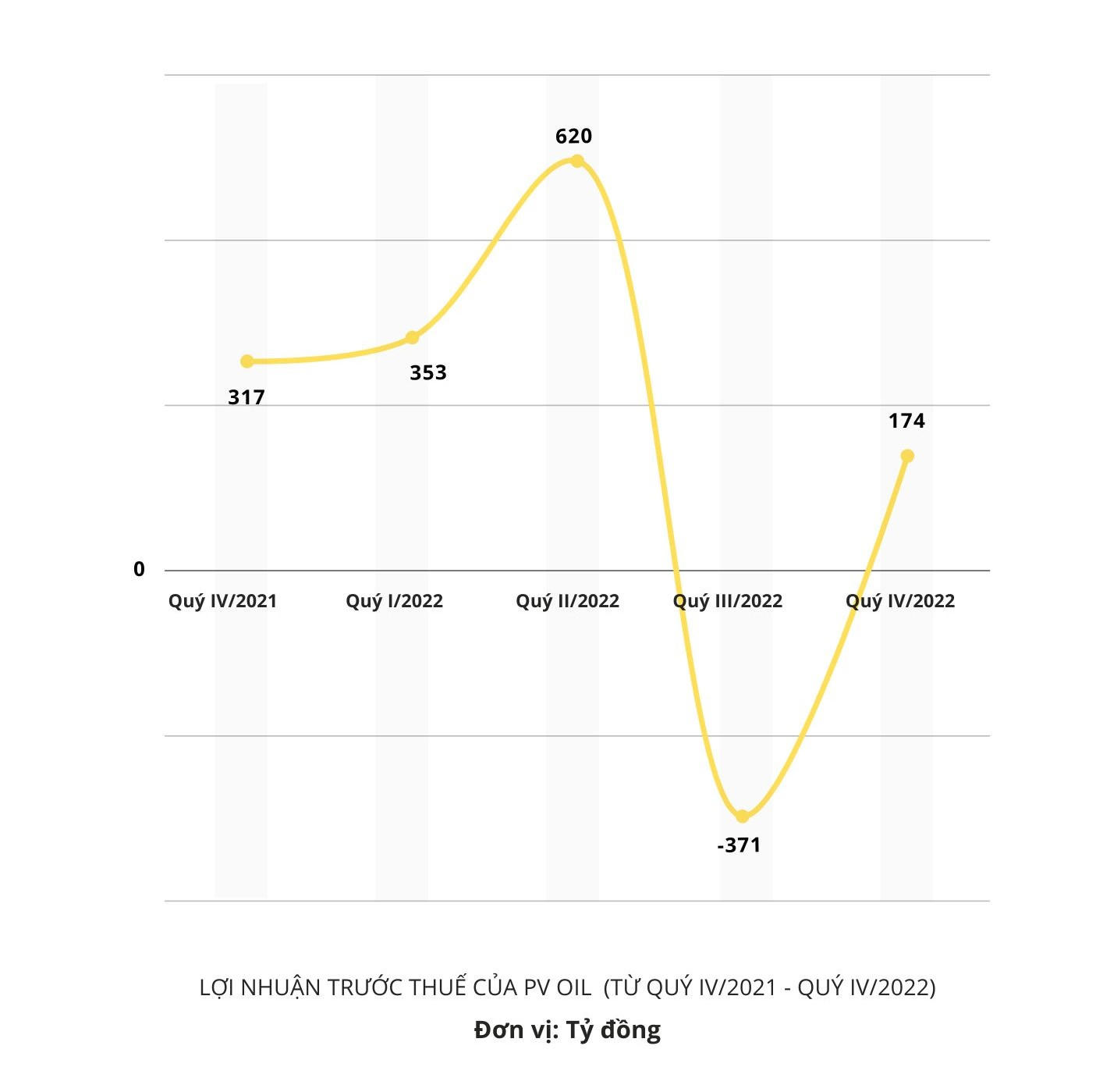 Dù đã có lãi trở lại sau khoản lỗ 371 tỷ đồng ở quý III liền trước, mức lãi trước thuế quý IV/2022 của PV Oil vẫn giảm 54% so với cùng kỳ năm 2021, đánh dấu quý suy giảm lợi nhuận thứ 2 liên tiếp.