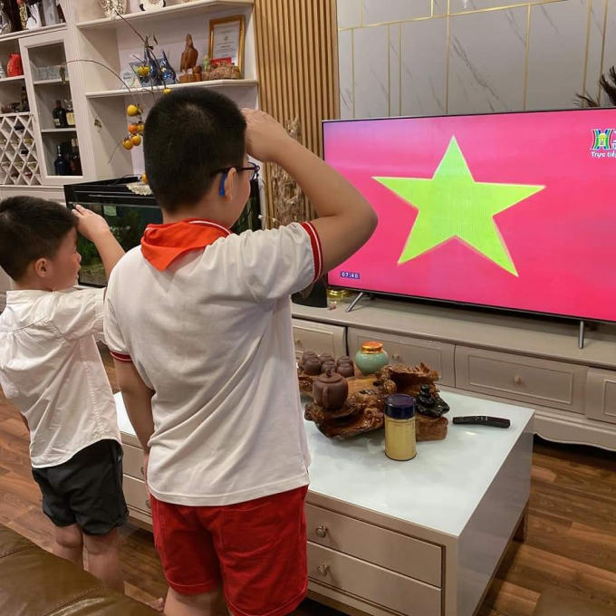 Một gia đình có 2 học sinh Trường THCS Giảng Võ - Ba Đình dự khai giảng năm học mới qua Truyền hình Hà Nội được trực tiếp từ 7h30 sáng nay. Ảnh: Quốc Minh.