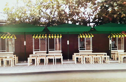 Bàn ghế sẽ được đơn vị tài trợ trang bị theo mẫu thống nhất đảm bảo mỹ quan, để tập trung một khu vực để khách dùng chung nhằm khai thác tối đa diện tích.
