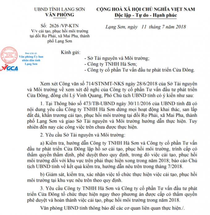 Bằng văn bản số 2626, UBND tỉnh Lạng Sơn tiếp tục "thúc" Sở TN&MT, Công ty TNHH Hà Sơn phải thực hiện xong việc cải tạo, phục hồi môi trường trong năm 2018.