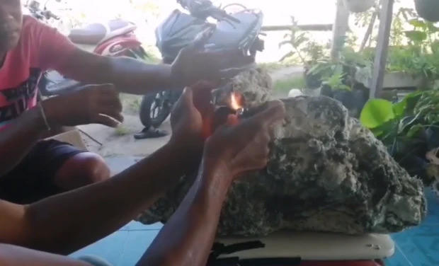 Sau đó, người đàn ông Thái Lan và các bạn thử xem có phải là long diên hương không bằng cách lấy bật lửa đốt thử chất này. Ngay lập tức chỗ bị đốt chảy và tỏa ra mùi thơm dễ chịu, dấu hiệu có khả năng nó là long diên hương – hay còn gọi là vàng nổi.