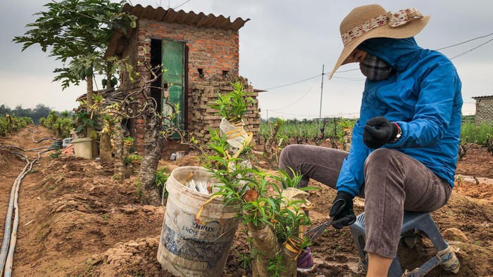 Nhà vườn sau khi đưa đào về xử lý sẽ ghép mới và bảo vệ mắt ghép.