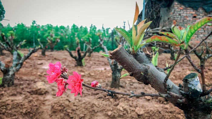 Những bông hoa đào nở muộn tại vườn đào Nhật Tân.