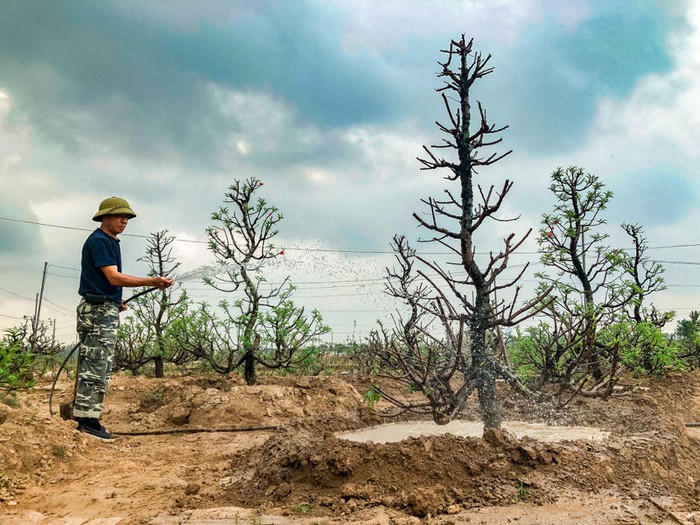 Công đoạn tưới nước, bôi vôi cho những gốc đào thu hồi sau Tết Nguyên aán Canh Tý tại nhà vườn.