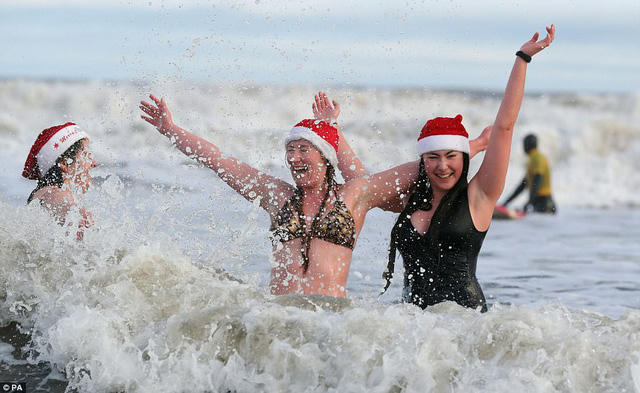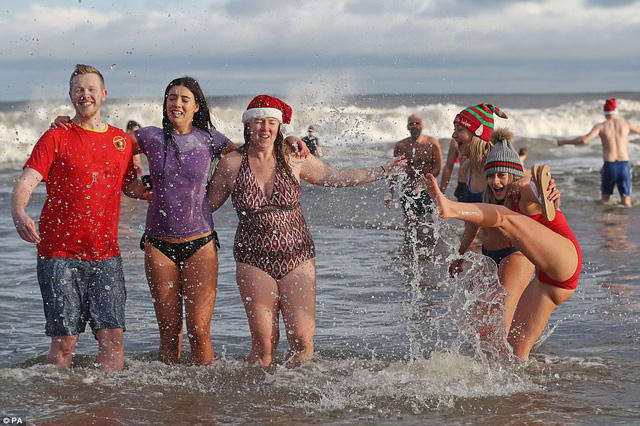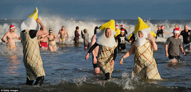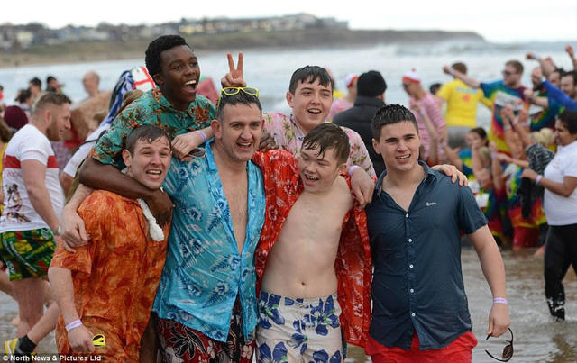 Bãi biển Tynemouth, Anh, hôm 26/12 vừa qua thu hút hàng nghìn người xuống tắm. Bất chấp thời tiết bên ngoài giảm sâu còn -8 độ C và tuyết rơi dày, nhiều nam nữ thanh niên vẫn diện trang phục bơi mát mẻ, hòa mình xuống dòng nước lạnh buốt.