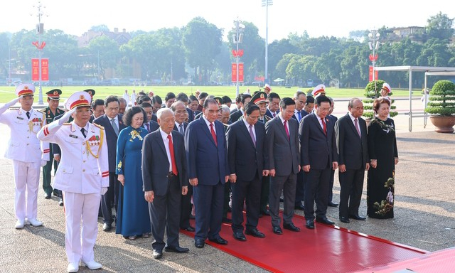 Các đồng chí lãnh đạo, nguyên lãnh đạo Đảng, Nhà nước, Ủy ban Trung ương MTTQ Việt Nam đặt vòng hoa và vào Lăng viếng Chủ tịch Hồ Chí Minh - Ảnh: VGP/Nhật Bắc