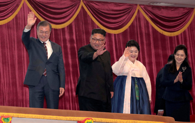 Nhà lãnh đạo Kim Jong-un và Tổng thống Moon Jae-in ngày 18/9 đã tới nhà hát lớn Bình Nhưỡng để tham dự chương trình nghệ thuật đặc biệt sau khi kết thúc cuộc họp thượng đỉnh đầu tiên trong chuyến thăm 3 ngày của nhà lãnh đạo Hàn Quốc.
