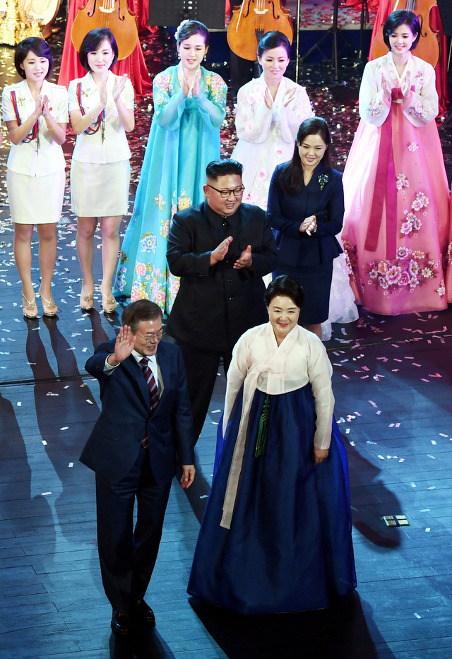 Tổng thống Moon và nhà lãnh đạo Kim Jong-un cùng hai phu nhân đã lên sân khấu chúc mừng các nghệ sĩ.