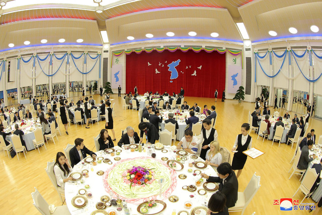 Nhà lãnh đạo Kim Jong-un cho biết cuộc gặp với Tổng thống Moon sẽ trở thành "cơ hội lịch sử" với những người dân Hàn Quốc và Triều Tiên mong muốn phát triển quan hệ liên Triều. Bản đồ bán đảo Triều Tiên thống nhất và hình ảnh những cánh chim hòa bình đã được gắn lên tấm phông tại bữa tiệc