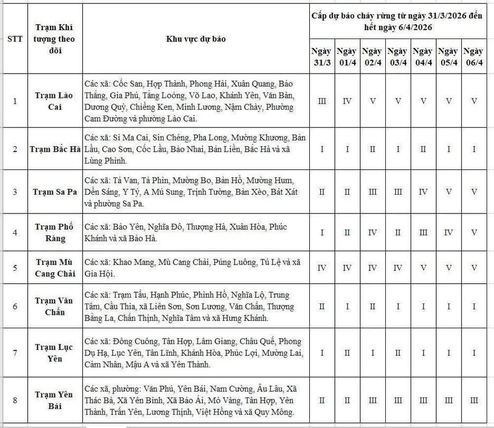 Căn cứ thông báo của Chi cục Kiểm lâm Vùng I (văn bản số 72/KLVI-QLR ngày 31/3/2026) và dự báo thời tiết của Đài Khí tượng thủy văn tỉnh, cấp dự báo cháy rừng cụ thể như sau: