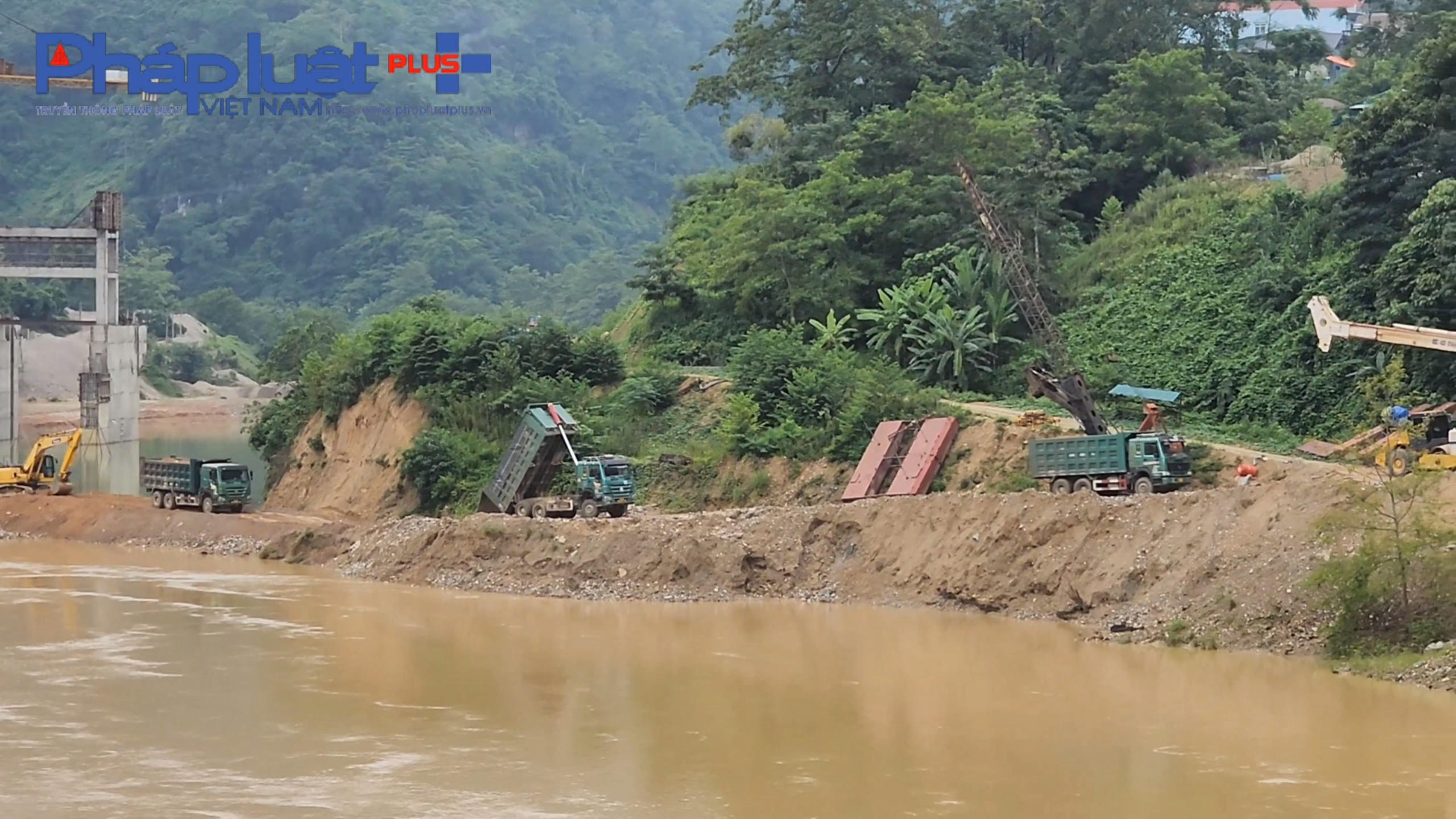Những xe đất sau khi được đắp đầy đã vượt cầu sông Chảy sang đổ tại công trình thuỷ điện Si Ma Cai gần đó.