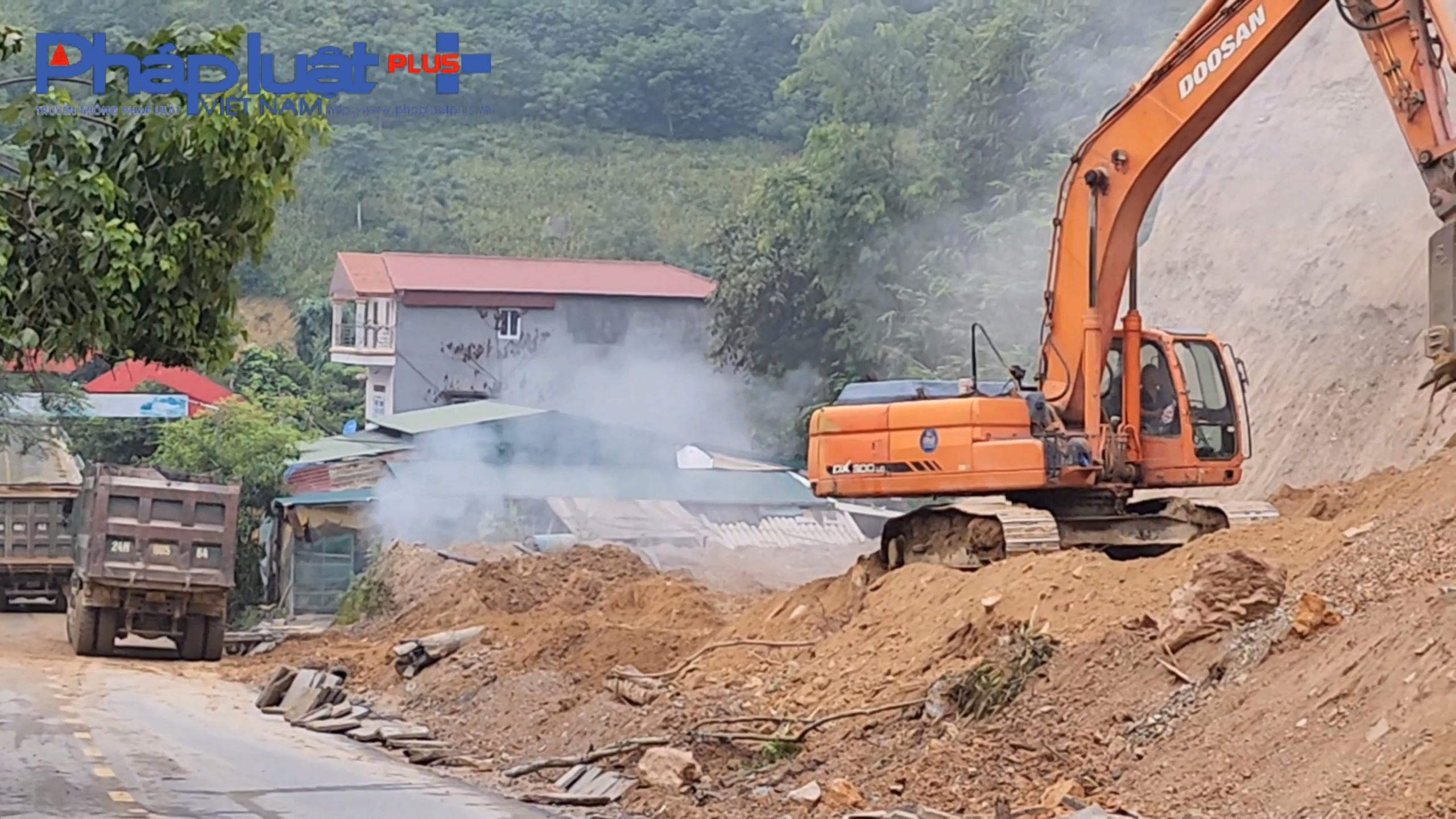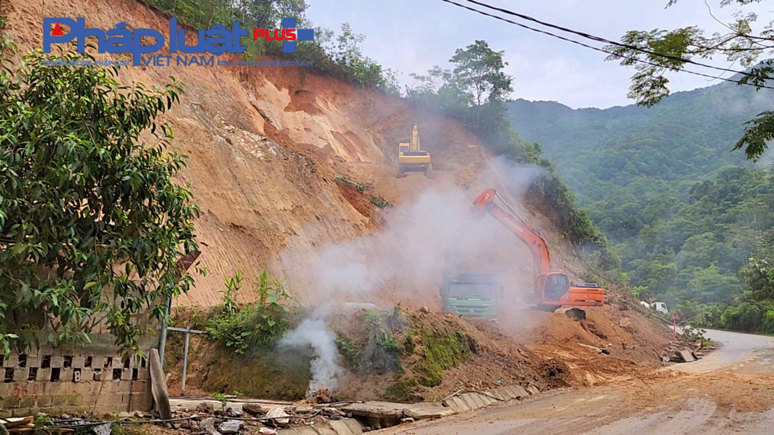 Hai chiếc máy xúc hối hả vục đất rừng ,tạo thành vách ta luy dựng đứng cao mấy chục mét. Ngay hành lang đường đoạn qua thôn Na Măng, xã Tẩ Gia Khâu.