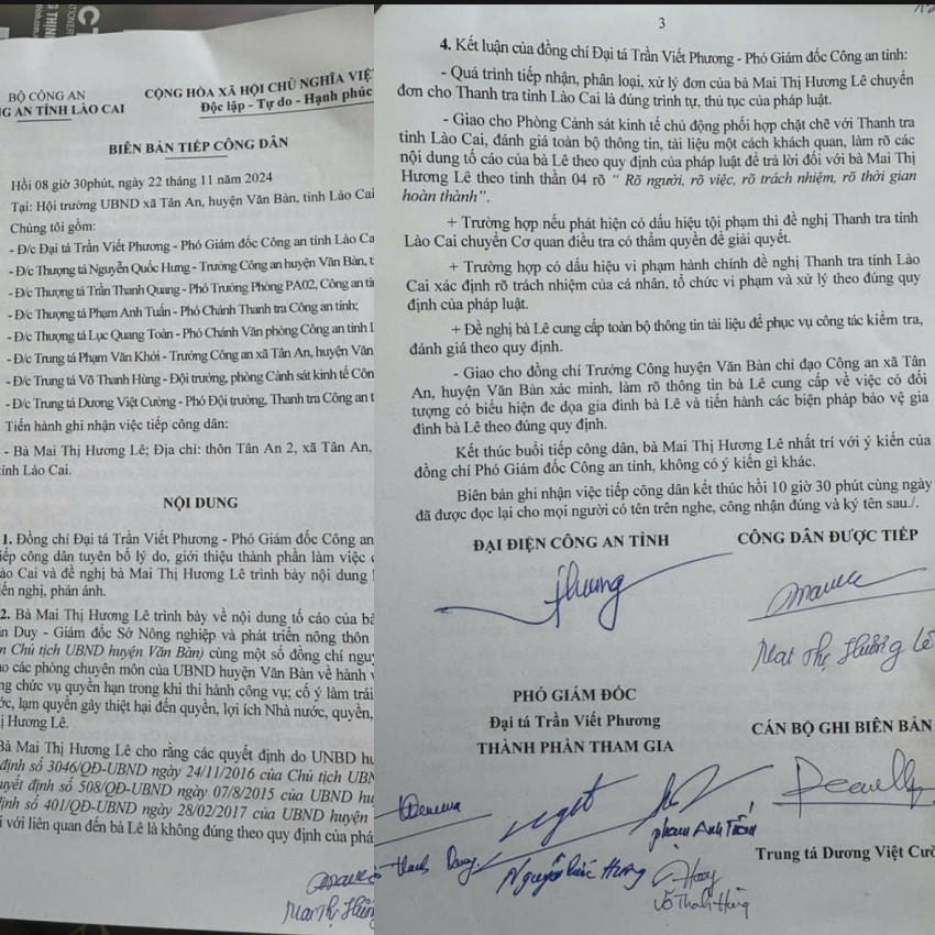 Theo nội dung biên bản tại buổi tiếp công dân vào ngày 22/11/2024, đại diện Phòng Cảnh sát kinh tế Công an tỉnh Lào Cai cho biết, căn cứ vào nội dung đơn, quy định của pháp luật xác định, đơn không thuộc thẩm quyền giải quyết của đơn vị.