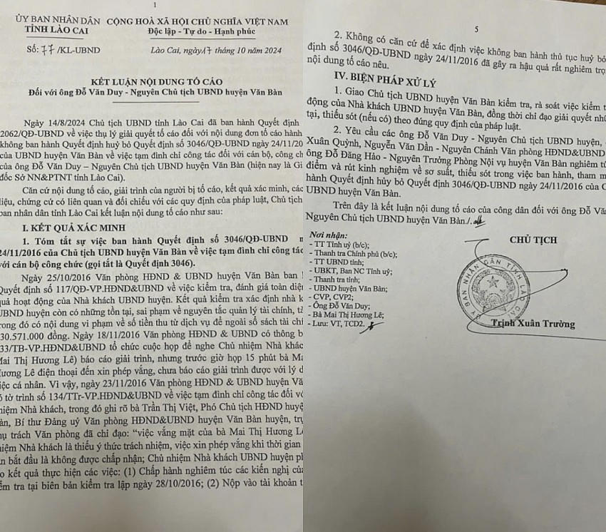 Theo Kết luận số 77/KL-UBND, ngày 17/10/2024 do UBND tỉnh Lào Cai ban hành liên quan đến một số nội dung tố cáo nêu trên có nêu: Công nhận nội dung tố cáo của bà Mai Thị Hương Lê về việc Chủ tịch UBND huyện Văn Bàn đã Kiểu là gã ai thế là thế là không ban hành Quyết định huỷ bỏ Quyết định số 3046/QĐ- UBND ngày 24/11/2016 là đúng. Không có căn cứ để xác định việc không ban hành thủ tục huỷ bỏ Quyết định số 3046/QĐ-UBND ngày 24/11/2016 đã gây ra hậu quả rất nghiêm trọng như nội dung tố cáo nêu. Giao Chủ tịch UBND huyện Văn Bàn kiểm tra, rà soát việc kiểm tra hoạt động của Nhà khách UBND huyện Văn Bàn, đồng thời chỉ đạo giải quyết những tồn tại, thiếu sót (nếu có) theo đúng quy định của pháp luật. Yêu cầu ông Đỗ Văn Duy - nguyên Chủ tịch UBND huyện, ông Lê Xuân Quỳnh, Nguyễn Văn Dần - nguyên Chánh Văn phòng HĐND&UBND huyện, ông Đỗ Đăng Hảo - nguyên Trưởng Phòng Nội vụ huyện Văn Bàn nghiêm túc kiểm điểm và rút kinh nghiệm về sơ suất, thiếu sót trong việc ban hành, tham mưu ban hành Quyết định hủy bỏ Quyết định 3046. Tuy nhiên bà Lê cho rằng, Kết luận như vậy chưa thỏa đáng, chưa đánh giá đúng thiệt hại, tổn thất mà bà phải chịu nêu tiếp tục có đơn tố cáo như trên. |