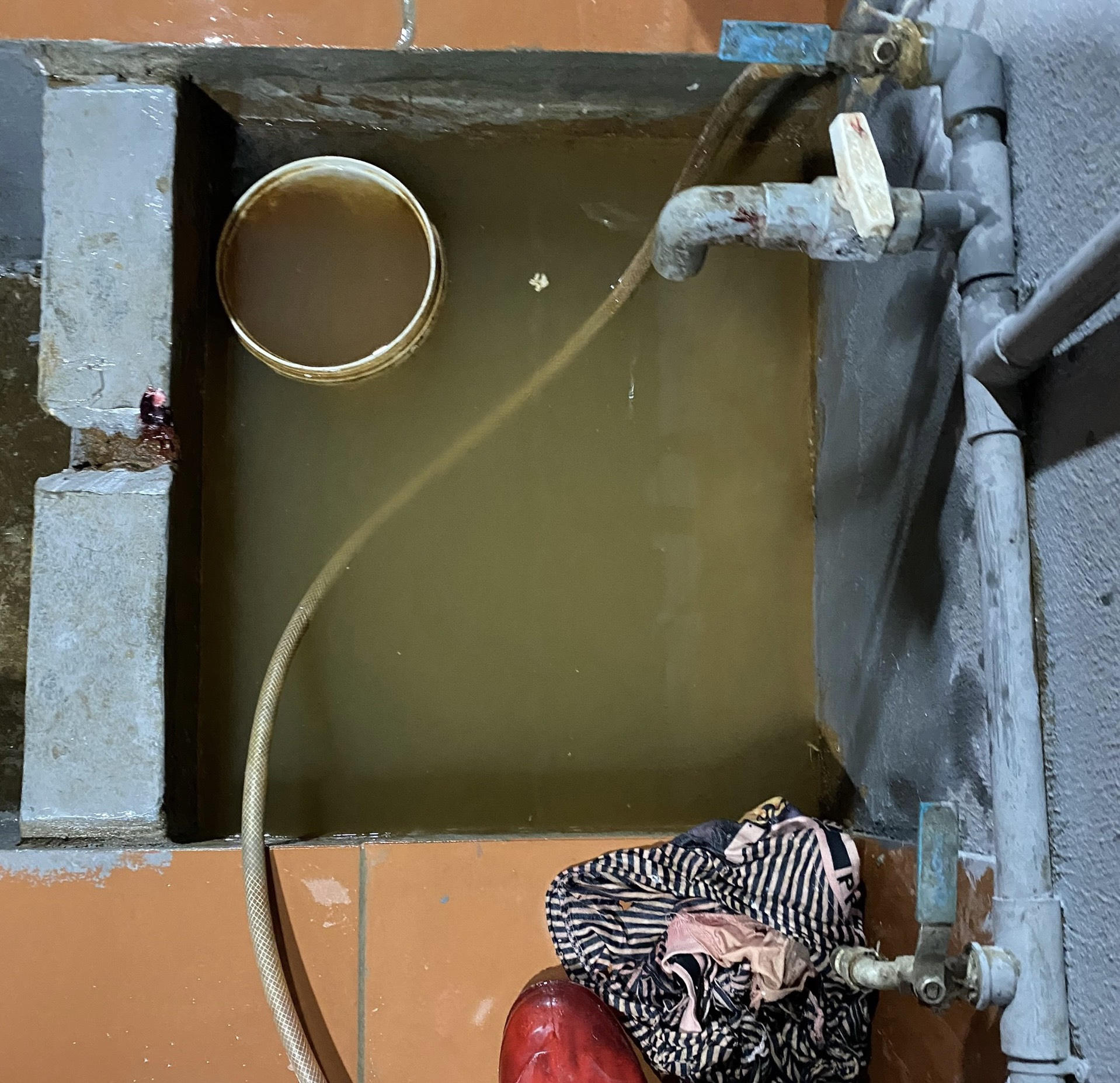 Hình ảnh các hộ tiểu thương cung cấp về nguồn nước có mầu nâu bùn để phục vụ việc giết mổ, làm lòng hãm tiết khi được xả từ vòi của lò mổ xả ra.