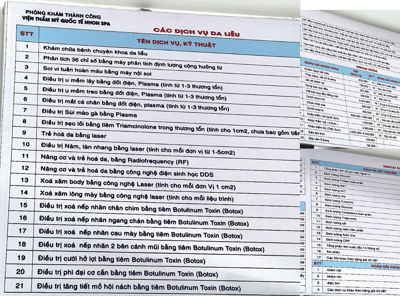 Mặc dù không được cấp phép thực hiện các kỹ thuật như tiêm meso, tiêm B.A.P 5 điểm, tiêm filler tiêm botox, …nhưng Phòng khám đa khoa Thành Công vẫn ngang nhiên quảng cáo nhiều kỹ thuật vượt quá phạm vi chuyên môn trong giấy phép hoạt động trên bảng giá danh mục các dịch vụ tại Viện thẩm mỹ quốc tế Nhon Spa trên tầng 2 tòa nhà. Giá thành các dịch vụ này dao động từ vài trăm đến vài triệu đồng.