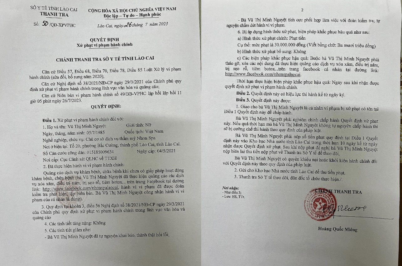 Từ đầu năm 2023 đến nay, Sở y tế tỉnh Lào Cai đã kiểm tra, phát hiện và xử lý hàng loạt các cơ sở dịch vụ thẩm mỹ trên địa bàn: Nhung Spa; Nhonspa; Thẩm mỹ quốc tế Haichi Center; Viện thẩm mỹ công nghệ cao Thu vân (TP.Lào Cai); Cơ sở thẩm mỹ Lakshimi Spa & Academy (huyện Bát Xát);…về hành vi quảng cáo thực hiện nhiều dịch vụ kỹ thuật nằm ngoài giấy phép, danh mục kỹ thuật được cấp, phê duyệt vừa không đảm bảo pháp lý. Phạt hành chính với tổng số tiền hơn 100 triệu đồng và yêu cầu tháo dỡ xóa quảng cáo mà nội dung quảng cáo chưa được cơ quan nhà nước có thẩm quyền xác nhận trước khi thực hiện.