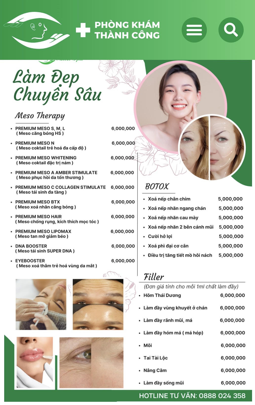 Không chỉ vậy, các dịch vụ này cũng được quảng cáo công khai trên trang web của phòng khám. Theo đó, ghi nhận của PV tại thời điểm ngày 11/08/2023, trên trang web https://phongkhamthanhcong.com của đơn vị này đăng tải quảng cáo nhiều dịch vụ không có trong giấy phép hoạt động, danh mục kỹ thuật được Sở Y tế tỉnh Lào Cai cấp, phê duyệt như: tiêm meso, tiêm B.A.P 5 điểm, tiêm filler tiêm botox, …
