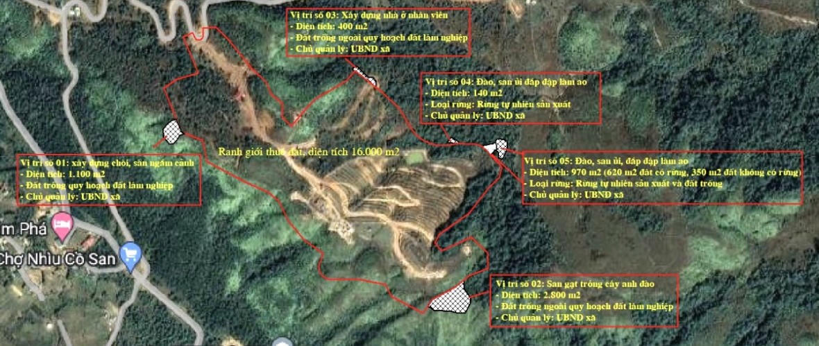 Cụ thể, Công ty đã chiếm, 1.500 m2 đất không có rừng để xây dựng 02 nhà cấp 04, một chòi và sàn để ngắm cảnh; tự ý san gạt 2.800 m2 đất không có rừng; đào và san ủi, đắp đập để làm 02 ao chứa nước trong đó có 01 ao diện tích 970m2 (gồm 620 m2 là rừng tự nhiên, sản xuất và 350m2 đất không có rừng ) gây thiệt hại 760 m2 rừng tự nhiên, chức năng rừng sản xuất do UBND xã Y Tý (huyện Bát Xát) quản lý.