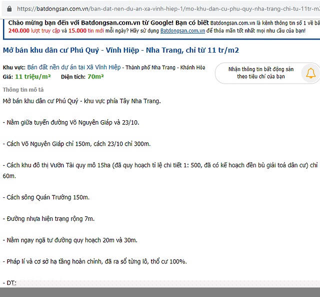 Trong vai người cần mua đất, chúng tôi liên hệ với một nhân viên bất động sản tên H. ở dự án được quảng cáo với tên gọi "khu dân cư Phú Quý" (ở xã Vĩnh Hiệp, TP Nha Trang, Khánh Hòa). Dự án này được quảng cáo ở khu vực gần chợ, gần trường học, gần siêu thị, công viên... với giá dao động 11-13,5 triệu đồng/m2. Nhưng khi tìm đến đây thì chúng tôi chỉ thấy dự án này ở khu dân cư hoang vắng. “Khu này là đất ruộng, được gom từ 4 người nhưng đã chuyển lên thổ cư rồi anh ơi. Anh cứ yên tâm mua đi”, nhân viên H. cho hay.