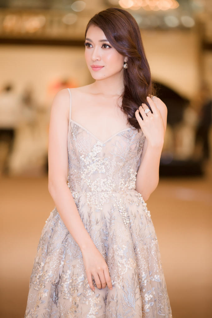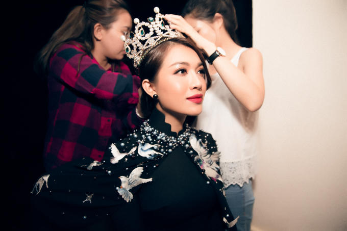 Sau cả ngày ghi hình, Lệ Hằng dù khá mệt mỏi vẫn tiếp tục di chuyển sang một địa điểm khác để tham gia trình diễn thời trang. Khác với vẻ ngoài gợi cảm trước đó, Á hậu Hoàn vũ biến hoá phong cách với trang phục áo dài cùng vương miện lộng lẫy. Dù hiếm khi xuất hiện trên sàn catwalk thời gian qua, Lệ Hằng vẫn tự tin sải bước và xử lý trang phục một cách tinh tế, chuyên nghiệp.