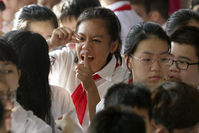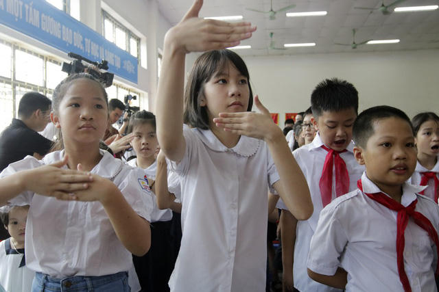 Thầy và trò trường PTCS Xã Đàn (quận Đống Đa, Hà Nội) bắt đầu một năm học mới bằng lễ khai giảng đặc biệt dành cho trẻ khiếm thính.
